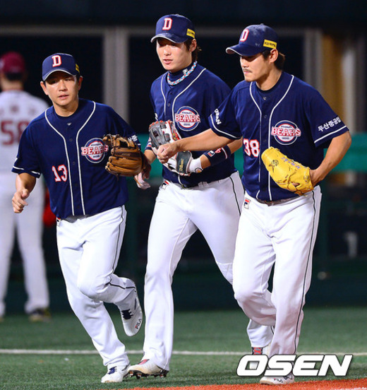 12일 오후 서울 목동구장에서 열린 2012 팔도 프로야구 넥센 히어로즈와 두산 베어스의 경기 3회말 2사 1,2루 넥센 이성열의 파울타구를 이원석 3루수가 몸날려 잡아냈다. 노경은 투수가 이원석과 손시헌 내야수비들과 하이파이브를 하고 있다.