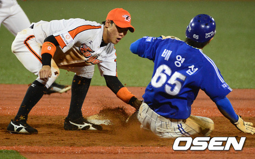 12일 오후 대전구장에서 열린 '2012 팔도 프로야구' 한화 이글스와 삼성 라이온즈의 경기, 5회초 2사 1루에서 한화 류현진의 견제에 걸린 삼성 배영섭이 2루에서 하주석에 태그아웃당하고 있다.