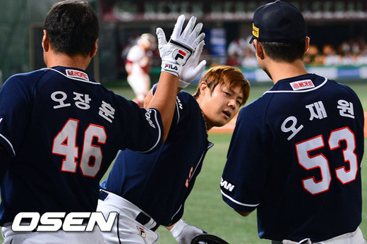 12일 오후 서울 목동구장에서 열린 2012 팔도 프로야구 넥센 히어로즈와 두산 베어스의 경기 6회초 1사 2루 두산 윤석민이 2점 홈런을 날리고 동료들의 축하를 받고 있다.