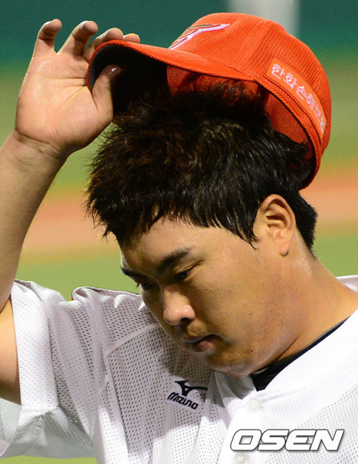 12일 오후 대전구장에서 열린 '2012 팔도 프로야구' 한화 이글스와 삼성 라이온즈의 경기, 2대0으로 앞선 상황에서 한화 류현진이 6회초 수비를 마치고 진지한 표정을 지으며 더그아웃으로 향하고 있다.