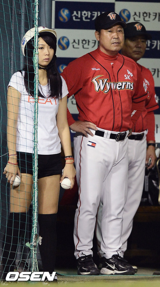 12일 오후 서울 잠실구장에서 열린 '2012 팔도 프로야구' LG 트윈스와 SK 와이번스의 경기에서 6회초 SK 이만수 감독과 LG 김민지 배트걸이 경기를 주시하고 있다.