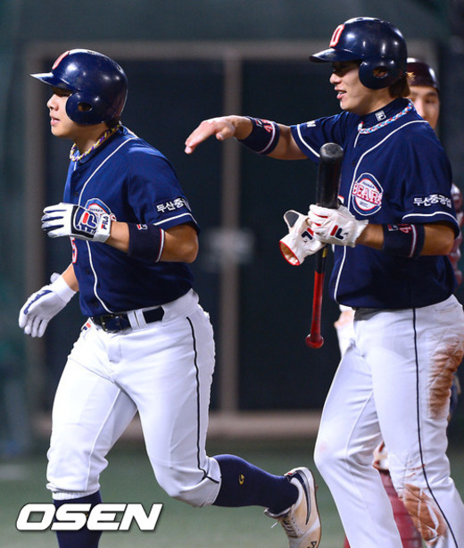 12일 오후 서울 목동구장에서 열린 2012 팔도 프로야구 넥센 히어로즈와 두산 베어스의 경기 6회초 1사 2루 두산 윤석민이 2점 홈런을 날리고 홈에서 이원석과 하이파이브를 하고 있다. 이원석은 전 타석에서 선취 1타점을 기록했다.