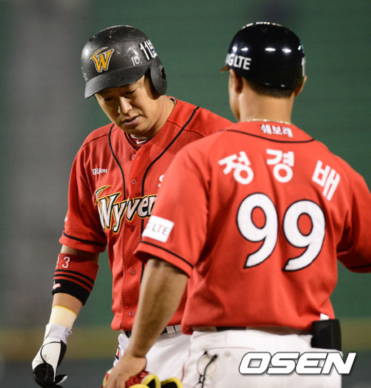 12일 오후 서울 잠실구장에서 열린 '2012 팔도 프로야구' LG 트윈스와 SK 와이번스의 경기에서 6회초 2사 주자 1,3루 SK 안치용이 우중간 1타점 적시타를 날린 후 1루에서 정경배 코치와 하이파이브를 하고 있다.