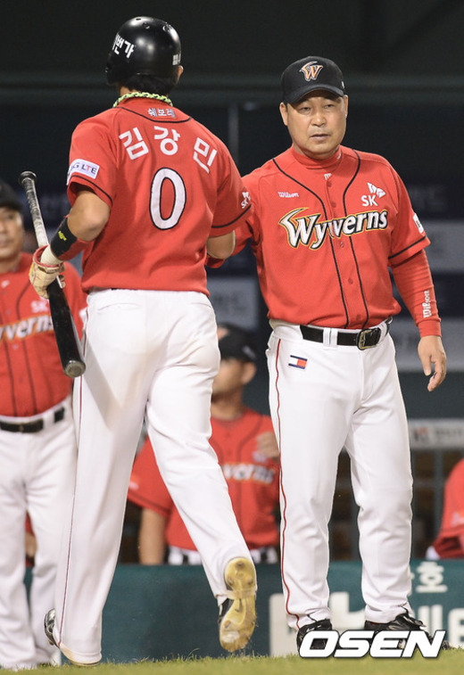 12일 오후 서울 잠실구장에서 열린 '2012 팔도 프로야구' LG 트윈스와 SK 와이번스의 경기에서 6회초 2사 주자 1,3루 SK 안치용의 우중간 1타점 적시타때 홈을 밟은 김강민과 이만수 감독이 하이파이브를 하고 있다.