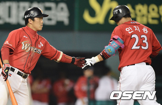 12일 오후 서울 잠실구장에서 열린 '2012 팔도 프로야구' LG 트윈스와 SK 와이번스의 경기에서 6회초 2사 주자 1,3루 SK 안치용이 우중간 1타점 적시타를 날린 후 정근우와 하이파이브를 하고 있다.