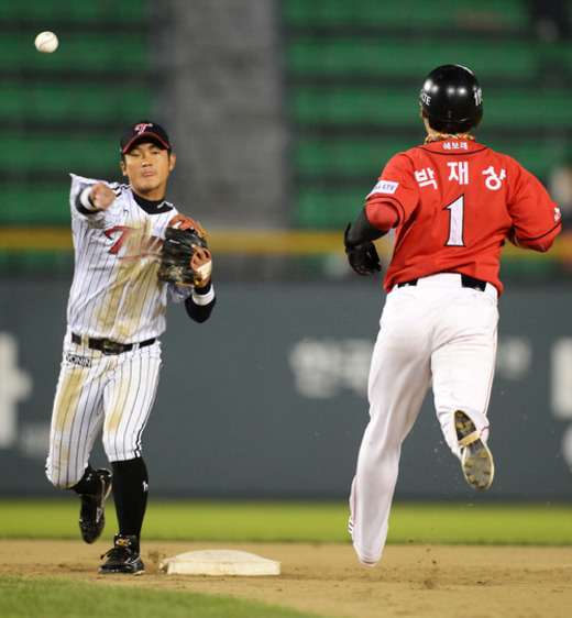 12일 오후 서울 잠실구장에서 열린 '2012 팔도 프로야구' LG 트윈스와 SK 와이번스의 경기에서 9회초 1사 주자 만루 SK 조인성의 유격수 앞 병살타때 LG 2루수 윤진호가 2루에서 박재상을 포스 아웃 시킨 후 1루로 송구하고 있다.