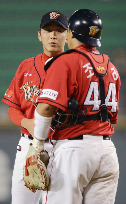 경기를 마치고 정우람과 조인성이 하이파이브를 하고 있다./ rumi@osen.co.kr