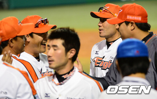 경기후 한화 류현진이 한용덕 대행을 포함한 코칭스태프의 축하를 받고 있다. /jpnews@osen.co.kr