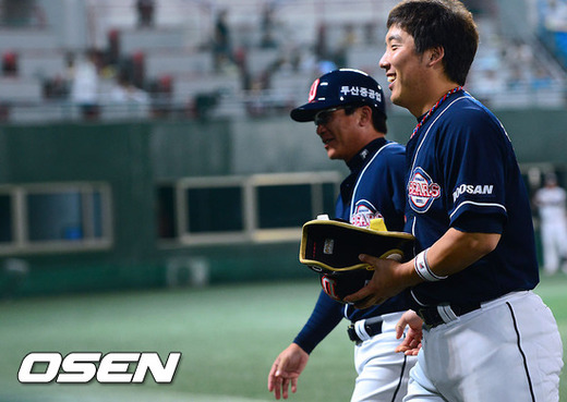 12일 오후 서울 목동구장에서 열린 2012 팔도 프로야구 넥센 히어로즈와 두산 베어스의 경기 결장한 두산 김현수가 전형도 코치 대신 보호대를 나르고 있다.