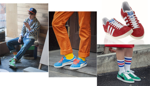 과거 톤 다운된 베이지, 블랙 등의 컬러가 주로 가을 슈즈에 입혀졌다면 레트로 빈티지 스타일 스니커즈는 스웨이드 갑피에 원색에 가까운 빨강, 초록, 파랑 컬러를 덧입어 복고스러운 느낌을 강조한 것이 특징이다.