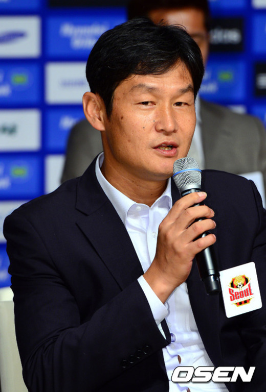 13일 오전 서울 아산청책연구원에서 진행된 '2012 K리그 스플릿 시스템 그룹A'(서울, 전북, 수원, 울산, 포항, 부산, 제주, 경남) 기자회견에서 서울 최용수 감독이 사회자의 우승팀을 지명해달라는 질문에 답변을 하고 있다.