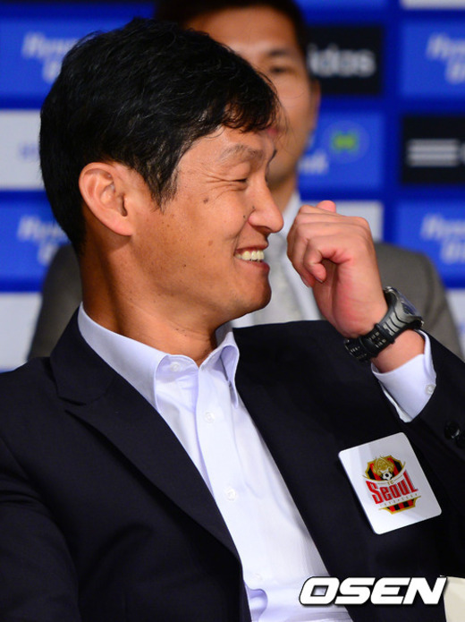 13일 오전 서울 아산청책연구원에서 진행된 '2012 K리그 스플릿 시스템 그룹A'(서울, 전북, 수원, 울산, 포항, 부산, 제주, 경남) 기자회견에서 최용수 서울 감독이 윤성효 수원 감독의 이야기에 미소를 짓고 있다.