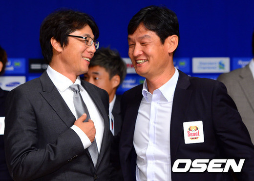 13일 오전 서울 아산청책연구원에서 진행된 '2012 K리그 스플릿 시스템 그룹A'(서울, 전북, 수원, 울산, 포항, 부산, 제주, 경남) 기자회견에서 최용수 감독과 황선홍 감독이 인사를 나누고 있다.