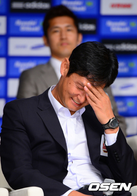 13일 오전 서울 아산정책연구원에서 진행된 '2012 K리그 스플릿 시스템 그룹A'(서울, 전북, 수원, 울산, 포항, 부산, 제주, 경남) 기자회견에서 최용수 서울감독이 취재진의 우승시 세레모니 질문에 즐거운 고민에 빠져있다.