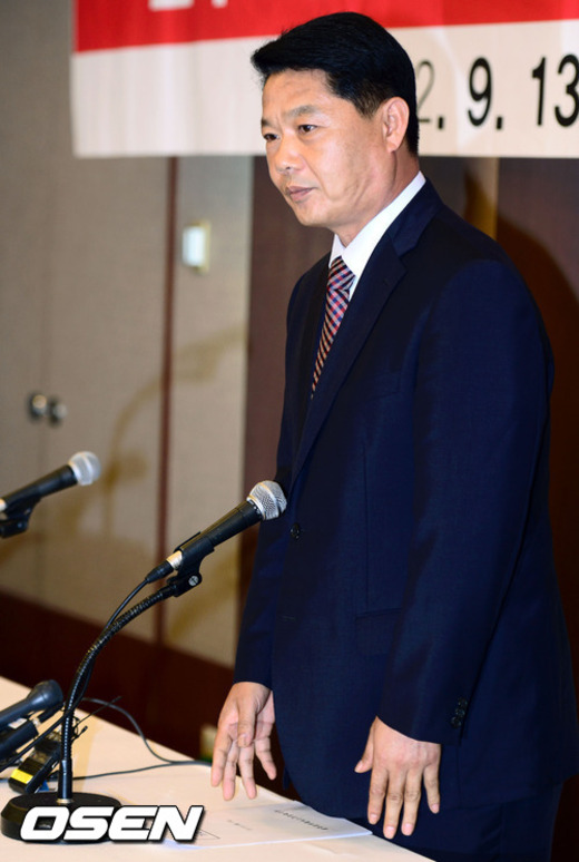 13일 오후 프레스센터 매화홀에서 열린 '상주 상무 강제 강등 관련 기자회견'에서 이재철 상주 상무 단장이 취재진을 바라보고 있다.