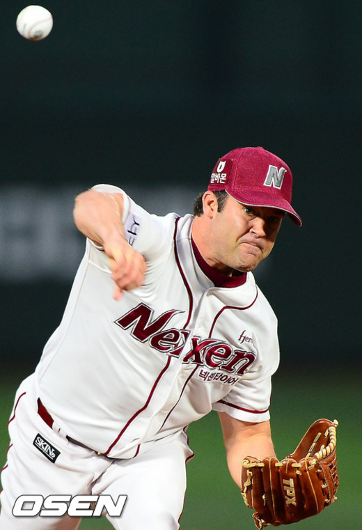 13일 오후 서울 목동구장에서 열린 '2012 팔도 프로야구' 넥센 히어로즈와 두산 베어스의 경기에서 넥센 선발 나이트가 힘차게 공을 뿌리고 있다.