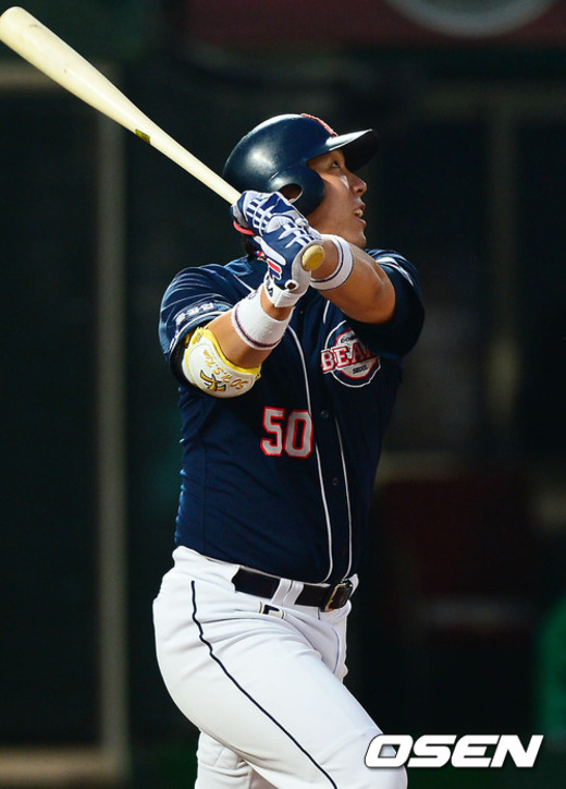 13일 오후 서울 목동구장에서 열린 '2012 팔도 프로야구' 넥센 히어로즈와 두산 베어스의 경기에서 1회초 무사 2, 3루 두산 김현수가 희생플라이를 날리며 선취타점을 올리고 있다.