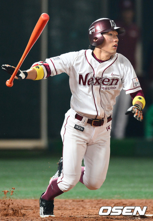 13일 오후 서울 목동구장에서 열린 '2012 팔도 프로야구' 넥센 히어로즈와 두산 베어스의 경기에서 1회말 무사 주자 1루 넥센 서건창이 우익수 오른쪽 1타점 3루타를 날리고 있다.