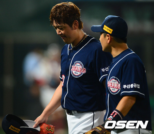 13일 오후 서울 목동구장에서 열린 '2012 팔도 프로야구' 넥센 히어로즈와 두산 베어스의 경기에서 4회말을 마친 두산 김선우가 덕아웃으로 들어가며 손시헌과 얘기를 나누고 있다.