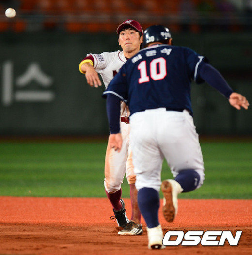 13일 오후 서울 목동구장에서 열린 '2012 팔도 프로야구' 넥센 히어로즈와 두산 베어스의 경기에서 6회초 1사 주자 두산 이원석의 병살타때 넥센 2루수 서건창이 1루에서 최준석을 포스아웃 시킨 후 1루로 송구하고 있다.