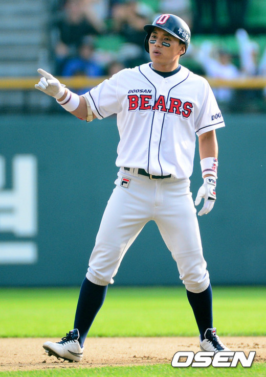 15일 오후 서울 잠실구장에서 열린 '2012 팔도 프로야구' 두산 베이스와 LG 트윈스의 경기, 1회말 무사에서 두산 이종욱이 LG 주키치를 상대로 2루타를 날리고 기뻐하고 있다.