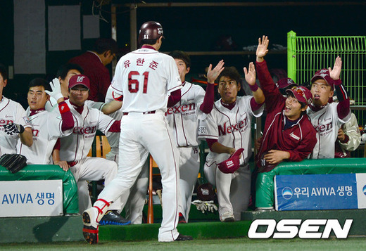 15일 오후 서울 목동야구장에서 열린 '2012 팔도 프로야구' 넥센 히어로즈와 한화 이글스의 경기, 8회말 무사 넥센 윤한준이 좌월 솔로홈런을 치고 더그아웃에서 동료들의 축하를 받고 있다.