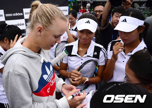 16일 오후 송파구 올림픽공원 테니스코트에서 열린 '테니스 클리닉'에서 미녀 테니스 스타 캐롤라인 워즈니아키가 청소년 선수들에게 사인을 해주고 있다.