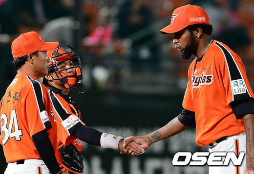 16일 오후 서울 목동구장에서 열린 '2012 팔도 프로야구' 넥센 히어로즈와 한와 이글스의 경기, 7회말 2사 1루 한화 바티스타가 마운드에서 내려가기 전 이준수와 악수하고 있다.