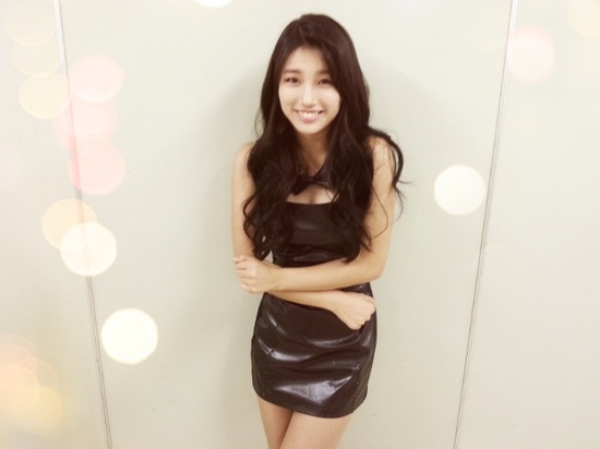 사진 속 수지는 블랙의 원피스를 입고 해맑은 미소를 짓고 있다. 특히 깊게 파인 튜브톱 원피스에 부각된 글래머러스한 몸매가 눈에 띈다.