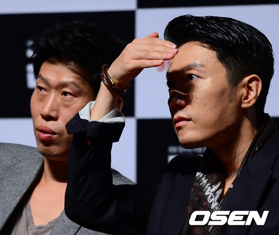 유해진과 김명민이 조명을 손으로 가린채 질문에 귀기울이고 있다.