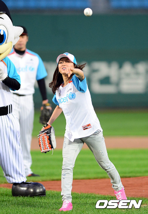 18일 오후 부산 사직구장에서 열린 '2012 팔도 프로야구' 롯데 자이언츠와 SK 와이번스의 경기 시작 전 남현희가 시구를 하고 있다.