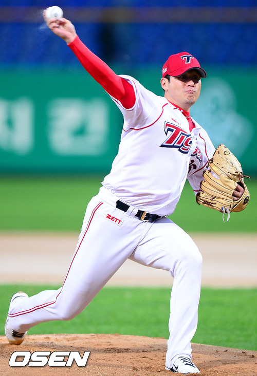 18일 오후 광주 무등구장에서 열린 '2012 팔도 프로야구' KIA 타이거즈와 두산 베어스의 경기에서 KIA 선발 서재응이 힘차게 공을 뿌리고 있다.