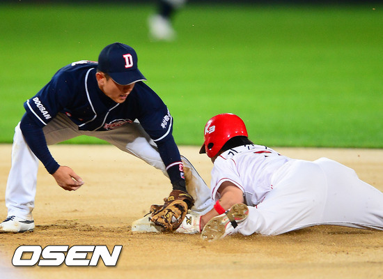 18일 오후 광주 무등구장에서 열린 '2012 팔도 프로야구' KIA 타이거즈와 두산 베어스의 경기에서 1회말 1사 주자 1루 KIA 김원섭 타석에서 1루 주자 김선빈이 2루 도루에 성공하고 있다.