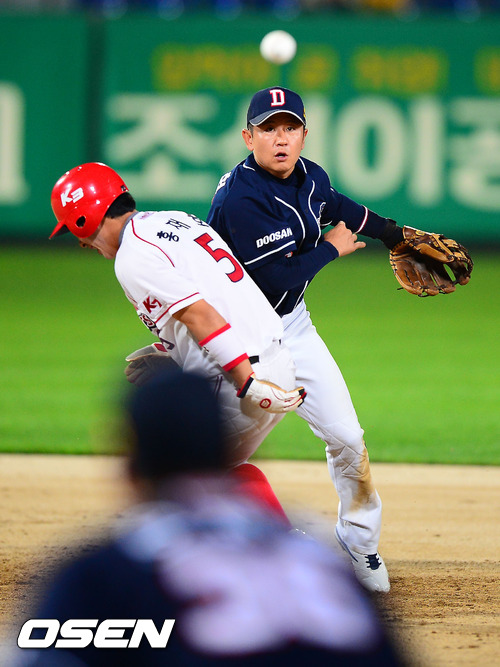 18일 오후 광주 무등구장에서 열린 '2012 팔도 프로야구' KIA 타이거즈와 두산 베어스의 경기에서 5회말 1사 주자 1루 KIA 김선빈의 2루수앞 병살타때 두산 유격수 손시헌이 2루에서 KIA 홍재호를 포스아웃 시킨 후 1루로 송구하고 있다.