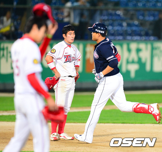 18일 오후 광주 무등구장에서 열린 '2012 팔도 프로야구' KIA 타이거즈와 두산 베어스의 경기에서 9회초 2사 주자 없는 상황에서 두산 오재일이 동점 솔로홈런을 날린 후 그라운드를 돌고 있다.