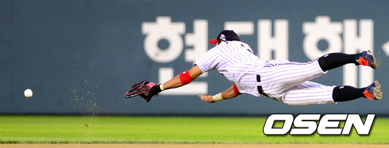 19일 오후 서울 잠실구장에서 열린 '2012 팔도 프로야구' LG 트윈스와 넥센 히어로즈의 경기, 1회초 LG 서동욱이 넥센 김민성의 타구를 잡기위해 슬라이딩 캐치를 시도하고 있다.