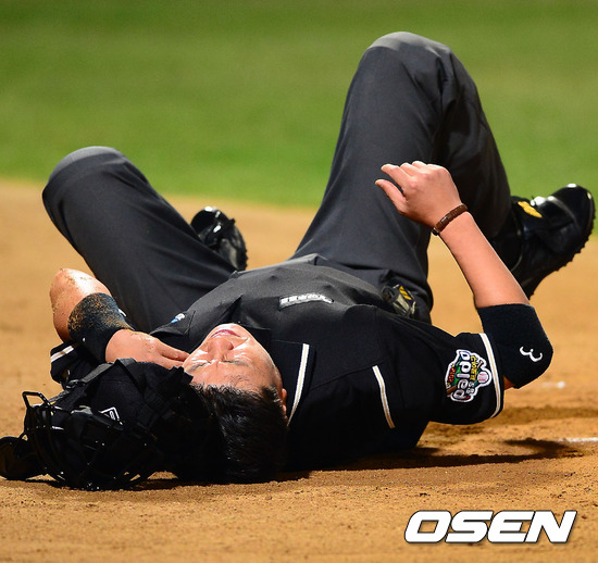 19일 오후 광주 무등구장에서 열린 '2012 팔도 프로야구' KIA 타이거즈와 두산 베어스의 경기에서 7회말 1사 주자 1루 KIA 안치홍이 타석에서 두산 선발 노경은의 볼을 배트에 맞췄으나 그 볼이 뒤에 서있던 박기택 구심에게 향했다. 박기택 구심이 안치홍 타구에 맞은 후 고통스러워 하고 있다.