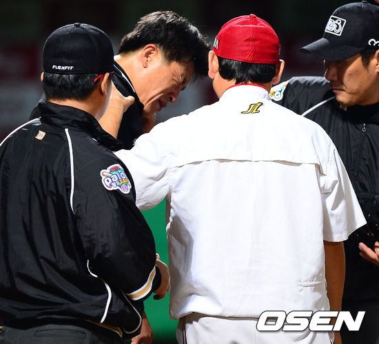 19일 오후 광주 무등구장에서 열린 '2012 팔도 프로야구' KIA 타이거즈와 두산 베어스의 경기에서 7회말 1사 주자 1루 KIA 안치홍이 타석에서 두산 선발 노경은의 볼을 배트에 맞췄으나 그 볼이 뒤에 서있던 박기택 구심에게 향했다. 박기택 구심이 안치홍 타구에 맞은 후 고통스러워 하고 있다.