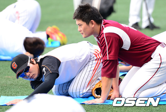 20일 오후 서울 목동야구장에서 열린 '2012 팔도 프로야구' 넥센 히어로즈와 롯데 자이언츠의 경기에 앞서 넥센 이성열이 스트레칭 훈련 중인 롯데 용덕한과 이야기를 나누고 있다.