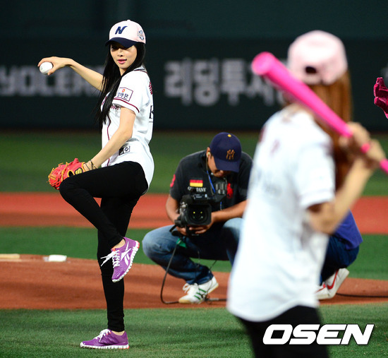 20일 오후 서울 목동야구장에서 열린 '2012 팔도 프로야구' 넥센 히어로즈와 롯데 자이언츠의 경기에 앞서 그룹 EXID 솔지가 시구를 하고 있다.