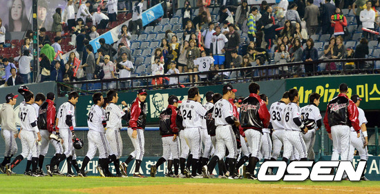 20일 오후 서울 잠실구장에서 열린 '2012 팔도 프로야구' LG 트윈스와 한화 이글스의 경기 종료 후 LG 선수들이 그라운드를 빠져나가고 있다.
