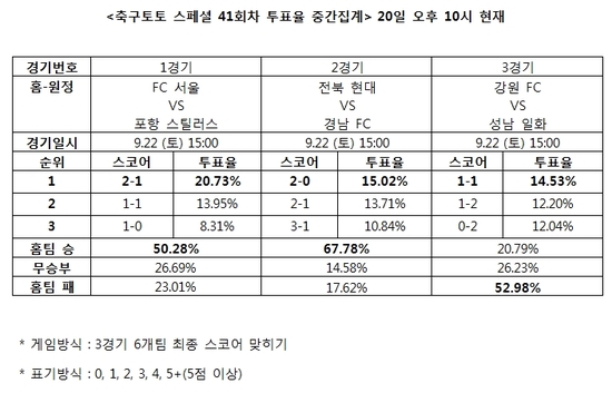 K-리그 3경기 대상 축구토토 스페셜 41회차 투표율 중간집계 결과