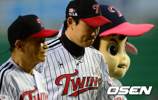 21일 오후 서울 잠실구장에서 열린 '2012 팔도 프로야구' LG 트윈스와 롯데 자이언츠의 경기, 경기에 앞서 LG 봉중근이 시구를 마친 아버지 봉동식 씨를 부축하며 마운드로 내려오고 있다. 이번 시구는 암투병중인 아버지의 쾌유를 바라고, 동시에 아버지에게 잊지못할 추억을 주고 싶다는 봉중근 선수의 요청을 구단이 흔쾌히 받아들여 이뤄지게 됐다. 봉중근은 포수 마스크를 쓰고 아버지의 공을 받았다.