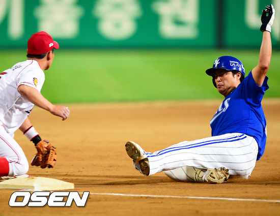 21일 오후 광주 무등구장에서 열린 '2012 팔도 프로야구' KIA 타이거즈와 삼성 라이온즈의 경기에서 1회초 무사 주자 2루 삼성 이승엽의 중견수 플라이 아웃때 2루 주자 박한이가 3루에 몸을 날리며 세이프되고 있다.