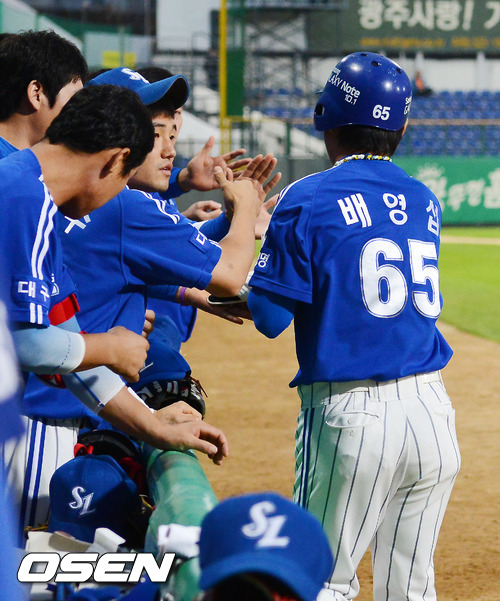 21일 오후 광주 무등구장에서 열린 '2012 팔도 프로야구' KIA 타이거즈와 삼성 라이온즈의 경기에서 1회초 무사 주자 1루 삼성 박한이의 좌중간 선취 1타점 적시타때 홈을 밟은 배영섭이 덕아웃에서 동료들과 하이파이브를 하고 있다.
