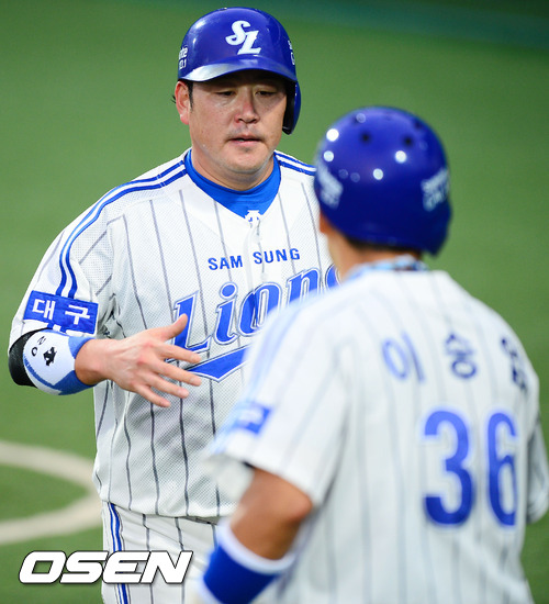 22일 오후 대구 시민구장에서 열린 '2012 팔도 프로야구' 삼성 라이온즈와 롯데 자이언츠의 경기에서 4회말 1사 주자 1,2루 삼성 정형식의 우익수 오른쪽 1타점 적시타때 홈을 밟은 진갑용이 이승엽과 하이파이브를 하고 있다.