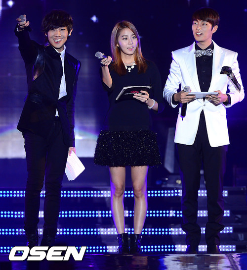 23일 오후 경북 경주시민운동장에서 열린 2012 한류드림콘서트에서 사회를 맡은 이준, 유이, 윤두준이 진행을 하고 있다.