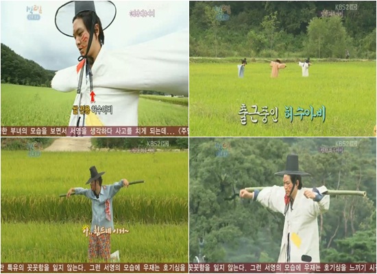 23일 방송된 KBS 2TV 주말 버라이어티 '해피선데이-1박2일' 경북 봉화 2탄에서는 퇴근 복불복에서 실패한 엄태웅과 주원 성시경이 가을 들판에 서서 허수아비 체험 벌칙을 받는 장면이 나와 웃음을 유발했다.