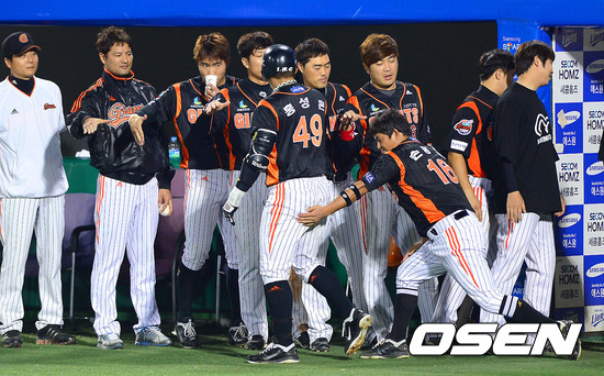 24일 오후 대구구장에서 열린 2012 팔도 삼성 라이온즈와 롯데 자이언츠의 경기 4회초 1사 롯데 홍성흔이 선취 솔로홈런을 날리고 동료들의 축하를 받고 있다.