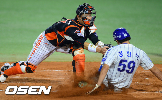 24일 오후 대구구장에서 열린 2012 팔도 삼성 라이온즈와 롯데 자이언츠의 경기 6회말 1사 3루 삼성 박석민의 내야땅볼때 롯데 용덕한 포수가 3루 주자 정형식을 태그아웃 시키고 있다.